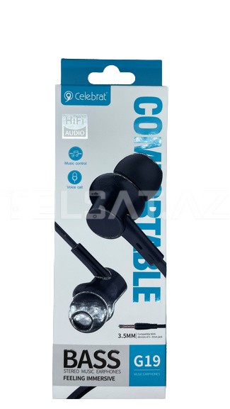 Celebrat G19 Qulaqlıqlar - premium stereo səslə bu şıxlı içi naushniklərə dalın. Rəngsiz dizayn və 3.5 mm səs təcrübəsi ilə Celebrat G19 təhlükəsiz və təcrübəli səslə təmin edir. Musiqinizin və zənglərinizin keyfini çıxarmağın sadə və şıx bir yolu. Celebrat G19 ilə səs dünyanızı təhrif edin - rəngsizlik və keyfiyyət bir arada. İndi sifariş edin və səsin keyfini çıxarın!